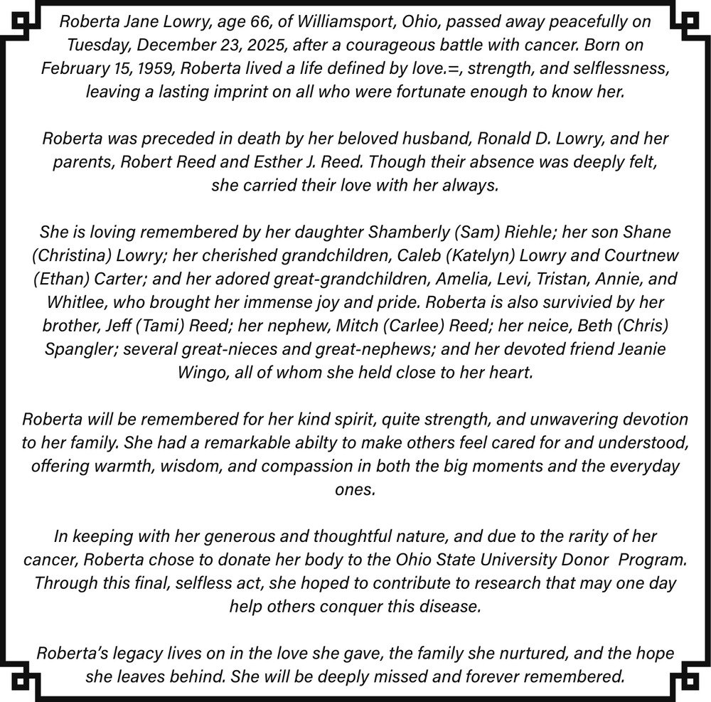 Jan 03, 2026. The Family of Roberta Jane Lowry Remembrance Ads from The Circleville Herald