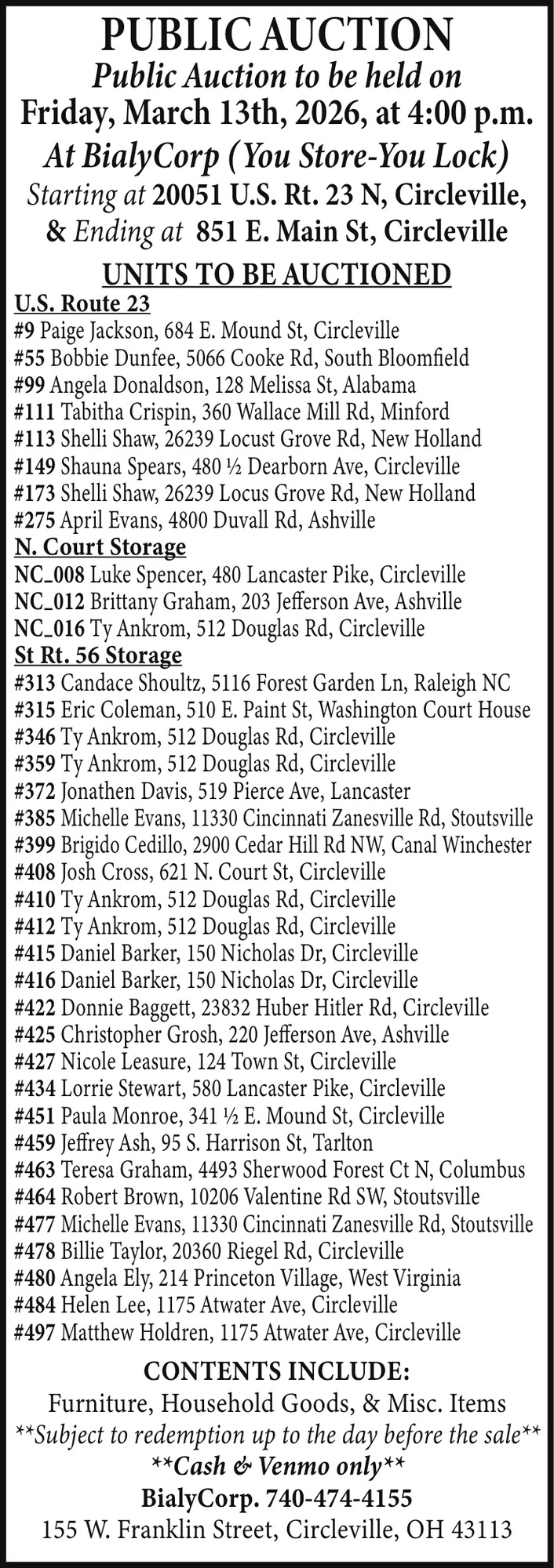 740-474-4155155 W. Franklin StCircleville, OH 43113(Bialy Corp)